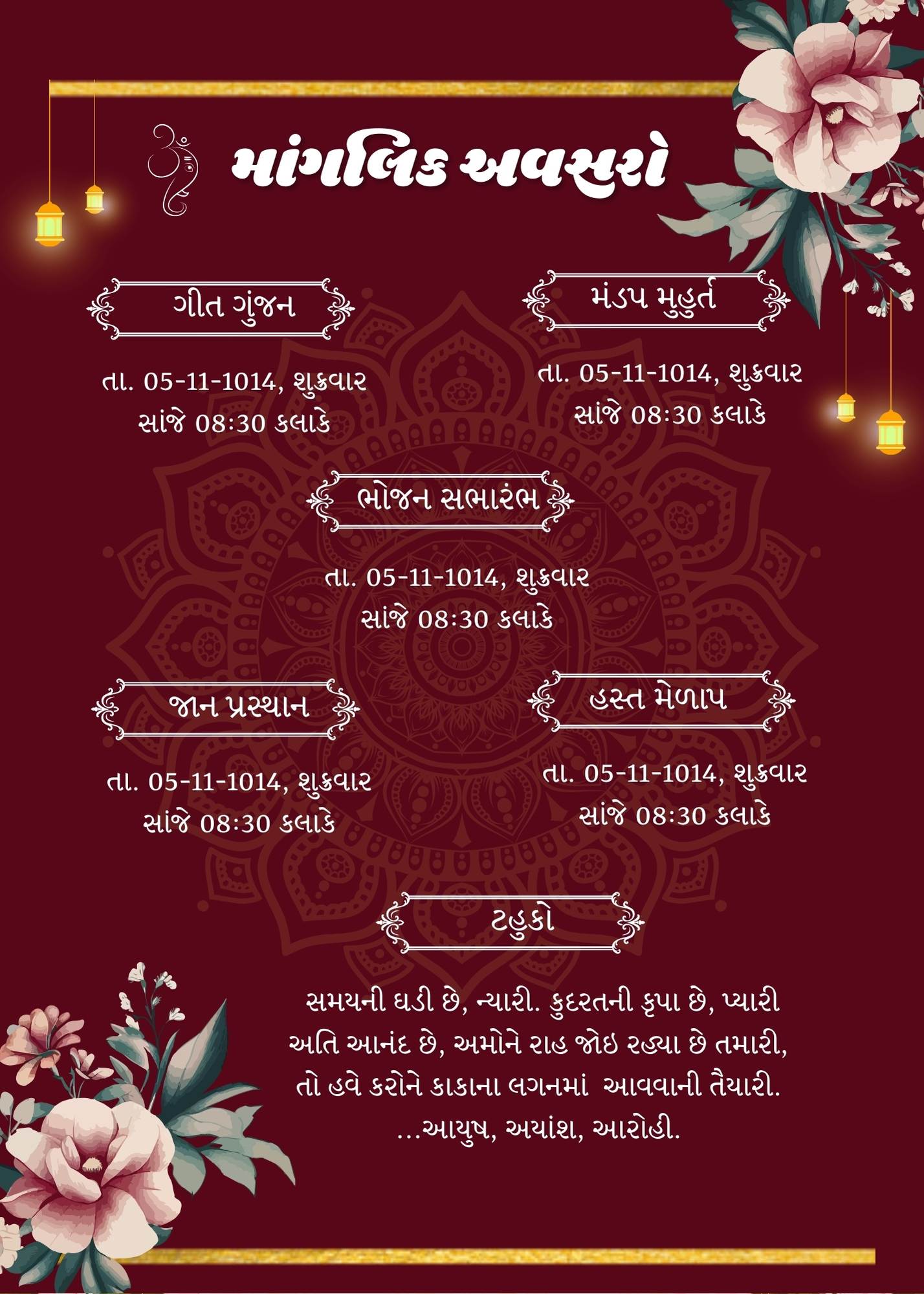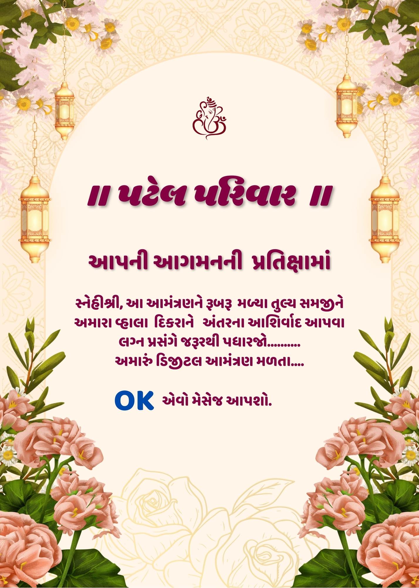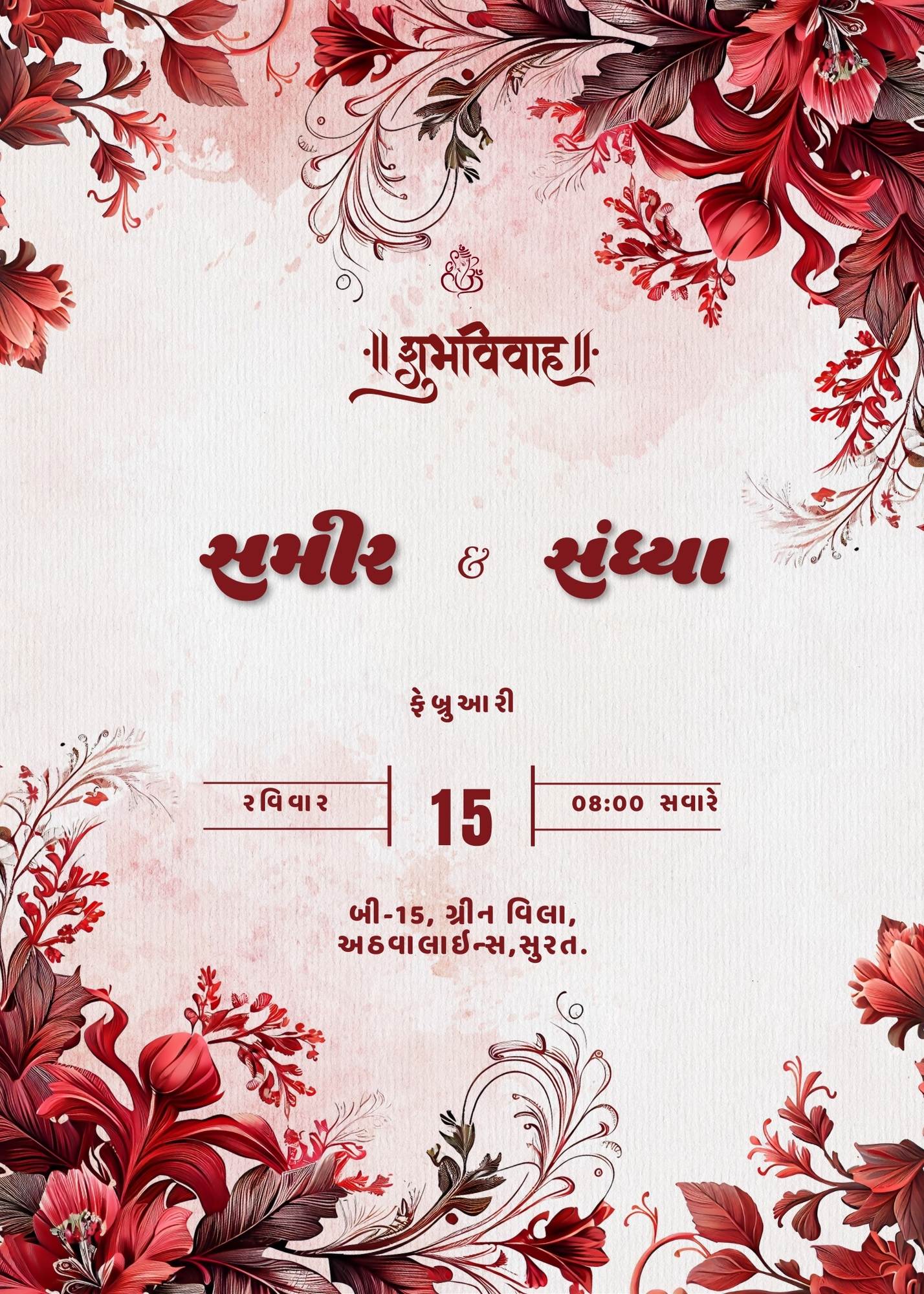 Celebrate your special day with this beautifully designed Gujarati digital wedding invitation card. Featuring elegant floral designs, cultural elements, and traditional Gujarati fonts, this invitation card is perfect for announcing your wedding in style. It includes intricate mandala art, subtle floral decorations, and customizable event details, all thoughtfully crafted to leave a lasting impression on your loved ones. Share your joyous occasion with this modern, eco-friendly digital invitation that reflects both tradition and sophistication.